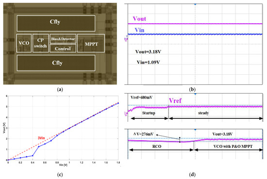 When changing the sunlight intensity, VBC input voltage varied from 0 to 1.8 V. The transfer characteristic of VBC we measured is shown in Figure 15c by testing and collecting the output voltage data point. It can be observed that when Vin is more than 0.5 V, the output voltage is already very close to 3 Vin, and the calculated voltage conversion efficiency can reach 99.4%. The results show that the VBC can operate at a relatively low input voltage. Figure 15d shows the Vref and the mode switch process of VBC. When the output voltage is established, Vref stabilizes at 680 mV. Furthermore, the waveform depicts that P&O MPPT algorithm makes output voltage improve 276 mV.