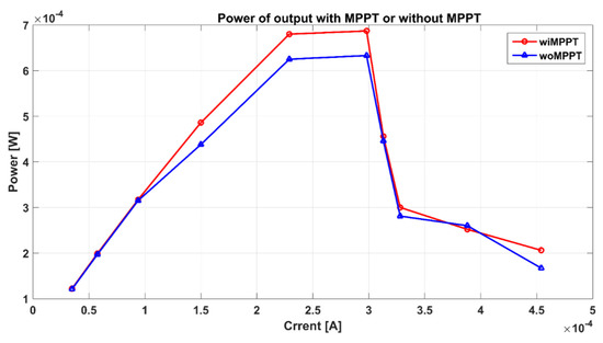 When the output current is ≈300 uA, P&O MPPT algorithm has the best effect, and we can know that output voltage has been improved by 8.53%.