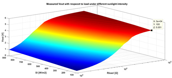 The performance of boosting voltage is depicted in Figure 17. Light intensity and output impedance decide the output voltage. The output voltage is measured and drawn in the relationship diagram (ignore the influence of temperature on the PV cell). It can be observed that the larger the load resistance, the larger the output voltage. When the load impedance is larger, the load current is smaller, and the light intensity has less influence on the output voltage. When SI is 100 W/m2, and the load impedance is 50 K, the output voltage of VBC is 5.051 V. Figure 17 also illustrates that an excessive output resistance can cause a failure to boost voltage.