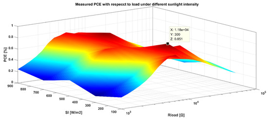 Same as the output voltage, PV cells’ output and input power are measured under different light intensities and output resistance. The PCE is the output power divided by the input power of the PV cell, as shown in Figure 18. It can be seen from the figure that the light intensity varies from 100 W/m2 to 1000 W/m2. During the change, the higher the light intensity, the higher the power corresponding value of the highest conversion efficiency, the greater the turning point. The highest conversion efficiency is relatively large when the light intensity is higher than a particular value. When the light intensity is constant, the PCE will rise and decline as the output current increases. Taking the effective light intensity of 300 W/m2 as an example, it is about 85.1% when the output current is 297 μA. When the voltage is large, the current is small, and the efficiency is not high. Results are identical to the relationship among the PV characteristics of the photovoltaic cell, the loss of the charge pump, and the frequency.