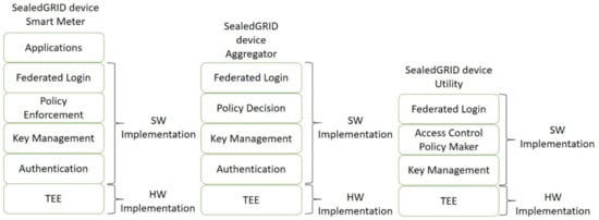 The component entities of the proposed functional architecture behind the smart grid, partially presented in Figure 1, are the following smart grid devices: smart meter, aggregator, and utility, together with the adversary parties involved in the SealedGRID scenario, which will affect the normal execution of access control procedures: the external adversary and the insider adversary.