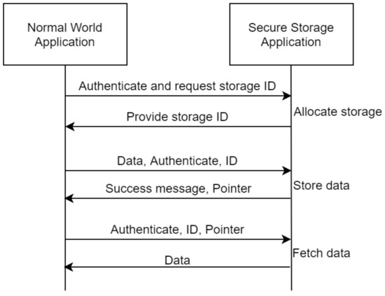 The data storage process can be called from the secure storage binary with the store directive, which essentially allows for storing a file in the secure storage with a given ID locator that will later be used for pulling this file. The following configurations must be specified for a successful data storage alongside with the store directive: (i) File name: the file name of the file to be stored and (ii) File identifier: The ID of the secure storage location where the file will be stored. Under the hood, the size of the file is computed to properly set all the required parameters which are then sent to the TEE. The trusted application on the other side, creates the corresponding persistent object that is populated with the TEE_WriteObjectData() function that copies the contents of the file in the persistent object.