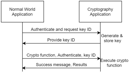 The key generation module is tasked with generating keys that reside only within the TEE and never leave it and this is achieved by utilizing the internal secure storage of the TEE that holds the generated keys. These are later pulled for cryptographic operations within the secure world, and when generating a key, a user must specify first the keygen directive after the binary call alongside with the following parameters: (i) Key ID: the ID which will be used for later accessing the key. Essentially it is used as a unique identifier for the storage ‘drawer’ that holds the key; (ii) Key Type: the type of the key that will be generated. Valid values for this flag are RSA for asymmetric cryptographic and signing keys or AES for symmetric cryptography keys; (iii) Key Size: the size of the key that will be generated. This needs to comply with standard practices and will affect the type of available cryptographic functionalities that will be available with said key (RSA 1024/2048, AES 128/256). Under the hood, the client application sends all the aforementioned information to the secure world application so that it can initialize the key generation process. This is broken to the actual key generation with all the desired properties, executed with the TEE_GenerateKey function and temporarily stored on the secure world in a TEE_ObjectHandle with the TEE_AllocateTransientObject function. With the object handle in hand, the trusted application continues to permanently store the key in its secure storage. This is achieved with the utilization of the TEE_CreatePersistentObject function that takes in the desired ID of the stored key that the user has defined.