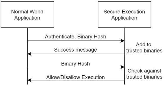 The binary enrolment process initially copies the binary in administrator-only directory to avoid any race condition vulnerabilities. It then proceeds to call the cryptographic component to produce the hash of the binary and then its certificate with the usage of the defined asymmetric key. With the certificate in hand, the final task is to store the certificate within the TEE through the secure storage component.