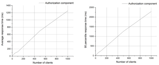 The authorization component was subjected to a stress test, using a series of scripts written in bash, as well as two tools: percentile (https://github.com/yuya-takeyama/percentile (accessed on 14 April 2021)) and ntimes (https://github.com/yuya-takeyama/ntimes (accessed on 14 April 2021)).