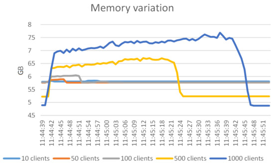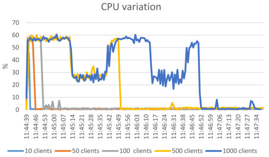 Analyzing Figure 11, we can see that the CPU consumption jumps to about 60% and remains until the concurrent API calls return. The more numerous the clients, the more the CPU consumption remains at 60%. A periodic drop to about 30% CPU for 500 and 1000 clients is noticeable. This behavior can be attributed to the thread scheduling in the Linux kernel used—some of the API calls are on hold and after some of them finish (about 60 s, which keeps CPU load at 60%), the rest that run after keep the CPU load at 30%.