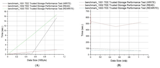 (A) WRITE, READ, REWRITE Tests—Data Size vs. Time and (B) Data Size vs. Speed.