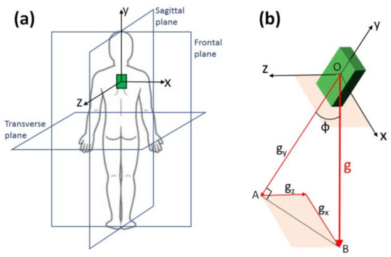 With reference to the IMU axes x, y, z defined in Figure 2a, a generic inclination angle ϕ of the IMU axis y relative to the gravity vector g (Figure 2b) can be obtained as follows: