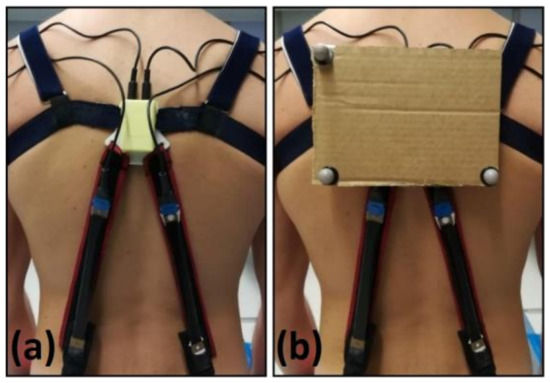 The sensors’ upper ends were attached to a plastic box, which contained wireless electronics and was located between the shoulder blades, whilst the lower ends were clamped to the user’s trousers (Figure 1).