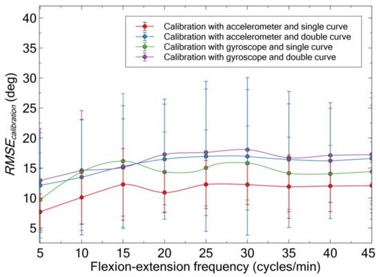 Comparison of the accuracy of the different strategies of calibration of the capacitive sensors, as quantified by the root mean square error between each calibrated signal and the stereophotogrammetry signal, for cyclic flexion-extensions at different frequencies. Each data point is originated by the average among 10 volunteers, considering two repetitions for each volunteer. The error bars represent the standard deviation.