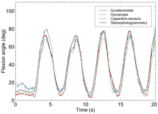 Figure 5 shows an example of angular signals simultaneously measured by the (calibrated) capacitive sensors, accelerometer, gyroscope, and stereophotogrammetry.