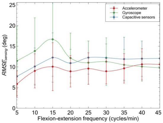 These data show the following evidence. Within the tested frequency range, the root mean square error’s maximum value was ~10 degs for the accelerometer, ~12 degs for the capacitive sensors, and ~17 degs for the gyroscope. The accelerometer showed the highest accuracy nearly across the whole range.