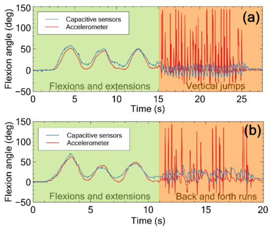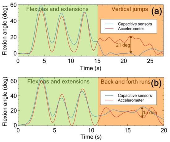 As evident, the accelerometer generated large peaks during the jumps and runs, due to dynamic acceleration-decelerations. Those peaks resulted in erroneous estimates of the flexion angle, as revealed by a comparison with the signals gathered by the capacitive sensors. Indeed, the latter were sensitive to the stretch, rather than to the acceleration, thus their dynamic response was not influenced by variations of velocity.