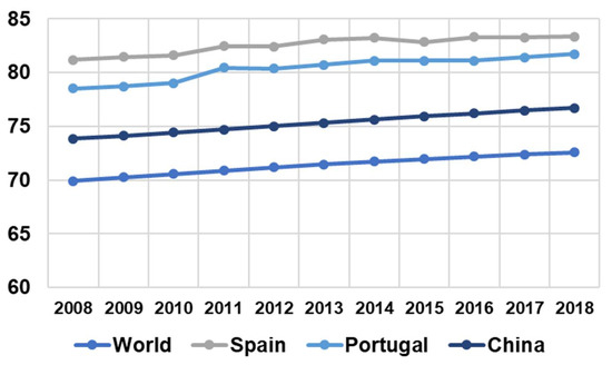 Currently, in many countries, the number of elderly people is growing due to the increase in the life expectancy of the population. Figure 1 shows the latest World Bank update on life expectancy in some countries and at the level global (as of 9 April 2020). For example, in Spain, life expectancy at birth was 81.18 in 2008, while by 2018, it had increased to 83.33 (a difference of 2.15 over 10 years) [1].