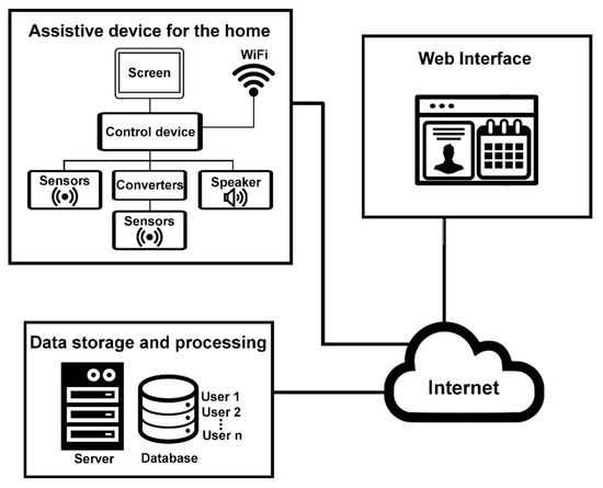 To describe in detail the materials used for the development of this system, it is necessary to have an overview of its structure. The developed IoT-based system is made up of a user assistance device that will be placed in the homes of users (elderly people who live alone); a web interface where caregivers and users can register and configure medication routines and medical appointments; and, finally, a server that handles and processes the information stored in the database. These three system components communicate with each other via the Internet. Figure 2 shows the general structure of the IoT SecurHome system.