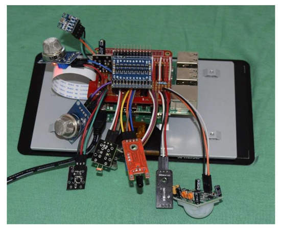 The ports used in the Raspberry Pi were a USB port for the speaker and general GPIO ports for four of the eight sensors, while another of the sensors uses the Raspberry Pi’s I2C protocol and the last three require conversions since their output is analog and/or over 3.3 V. Figure 3 shows the device for the home without its casing, with the Raspberry Pi and the connected sensors all visible.