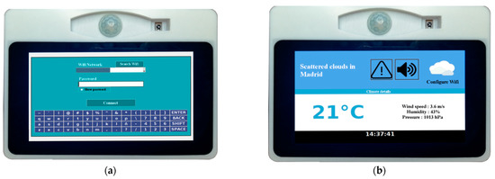 In the first interaction with the user, it will be necessary to configure Internet access; a drop-down menu will appear, where the Wi-Fi network of the home can be selected. Then, a keyboard will appear, which the user must use to enter the password. At the end of this process, by default, the device will display a screen with the weather in the user’s area. These features can be seen in Figure 4.
