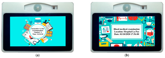 If the user does not want the device to make audible notifications (through the speaker), it is possible to turn off the speaker by clicking on the sound icon seen in Figure 4b. As mentioned above, the device offers two types of notifications, indicating to the elderly person when they should take their medication (name of the medication and amount to take) and also indicating when they have a medical appointment. The latter reminder is given twice, the day before the appointment (24 h before) and three hours before; this one specifies the type of medical appointment, and the time and location. All this information must be previously stored in our database and will have to be entered by the user themselves or by a caregiver, family member, or doctor (depending on the user’s level of dependency) through a web interface, which is currently under development. Figure 5 shows the two types of notifications that are provided by the device for the home.