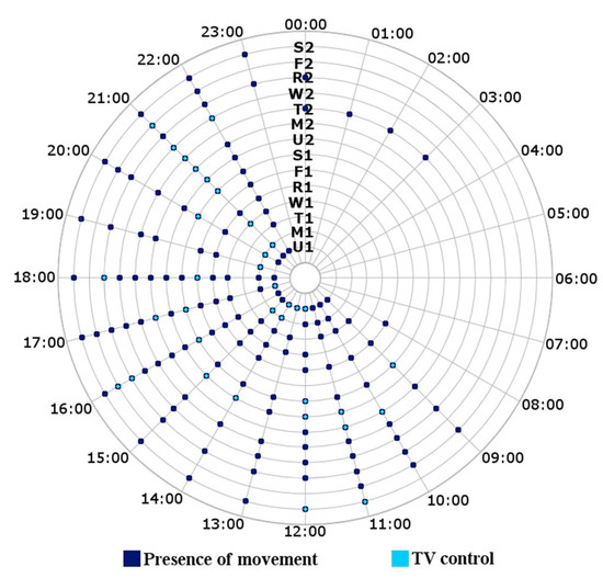 Movement behavior and interaction with the TV remote control to structure the default rules of the system. The axes show the time over the course of a day and the days of the week from the first Sunday (U1) to the second Saturday (S2) of calibration.