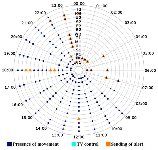 Figure 7 shows the motion detection (dark blue) and interaction with the TV remote control (light blue) over two weeks (starting on Wednesday), for 24 h each day. In addition, Figure 7 shows the alert messages that were sent by the SecurHome system (orange).
