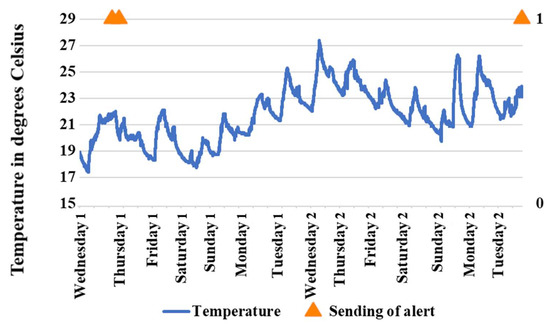 Figure 8 shows the behavior of the temperature during the two weeks studied. It also shows the alert messages sent considering the rules described above; these messages are represented in binary form, since they are sent by the triggering of an event. The SecurHome system sent three alert messages; two of these were on the same day (early morning of the first Thursday) and the third was on the second Tuesday of study. All three alert messages were sent due to the detection, at the user’s usual bedtime, of temperatures higher than the maximum temperature detected during the past afternoon. On the afternoon of the first Wednesday, a maximum temperature of 21.8 °C was detected; then, on the first Thursday, the system detected temperatures between 21.8 °C and 22.0 °C several times between 2:01 and 3:33, so it sent two alert messages. In addition, on the afternoon of the second Tuesday studied, a maximum temperature of 23.8 °C was detected; then, the device detected temperatures between 23.8 °C and 23.9 °C between 23:17 and 23:32 on the same Tuesday and sent an alert message.
