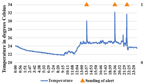 For the following experiment, three types of alteration were made to the environment of the room where the device for the home was placed. The temperature was intentionally and abruptly altered, and the device was placed in the presence of fire and gas on several occasions to observe the behavior of the system. Figure 9 shows the behavior of the temperature throughout the day of the experiment and the alert messages sent by the system considering only the changes in temperature. The alterations in the environment began to take place around 12:00 on the day of the experiment. Sudden temperature increases occurred in the following time ranges: between 13:51 and 14:00; between 19:29 and 19:36; and between 21:54 and 21:59. The caregiver received alert messages for this unusual behavior at 14:00, 19:36, and 21:59, respectively. The system currently sends the alert messages almost immediately; this will probably be modified in future work, to balance the server workload and the response time for sending alert messages.