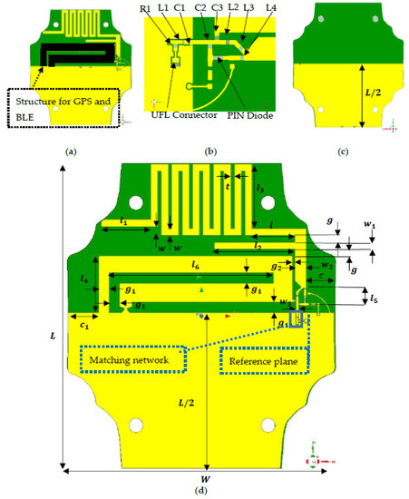 Proposed antenna: (a) top view: structure reserved for GPS and BLE (black color); (b) lumped components, UFL connector and PIN diode placements; (c) bottom view; (d) top view with geometric key parameters.