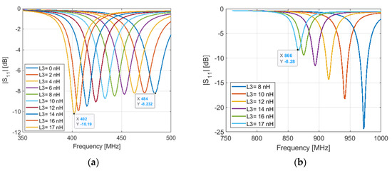 The second parameter that controls the lower and the higher resonant frequencies of the antenna in the OFF state is the value of the inductor L3. The resonant frequency at 401.5 MHz can be achieved by using an inductor of 17 nH in the place of L3, as shown in Figure 4a. We see that the higher resonant frequency shifts to lower frequencies when the inductance L4 increases, Figure 4b. This frequency shift can be compensated by adjusting the length l2 of the stub-like. With l2 = 23 mm, we obtain a resonant frequency at 866 MHz.