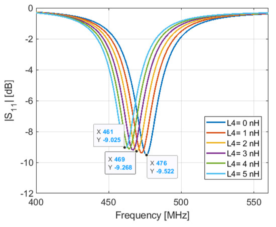 Simulated S11 for varied parameter L4 when the PIN diode is ON (Ls = 0.6 nH and Rs = 1 Ω).