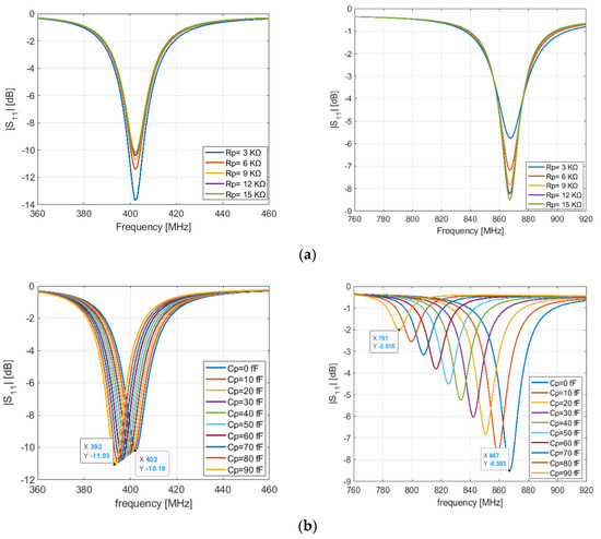 Figure 6b shows the S11 response for different values of the equivalent parallel capacitor of the PIN diode with Rp = 15 KΩ pF, L1 = 0 nH, C1 = 0 pF, L3 = 17 nH, L4 = 2 nH, l1 = 14.3 mm and l2 = 23 mm. We see that the parallel capacitor has a direct impact on the resonance frequency (868 MHz) and a slight impact on the lower frequency (401 MHz). When the capacitor value increases, the resonant frequencies shift to lower frequencies. Figure 6a shows the input reflection coefficient response at different value of the reverse parallel resistor Rp with Cp = 0 pF, L1 = 0 nH, C1 = 0 pF, L3 = 17 nH, L4 = 2 nH, l1 = 14.3 mm and l2 = 23 mm. The results show that a high equivalent resistor of the PIN diode in the OFF state helps to obtain a good impedance matching for both lower and higher frequencies, Figure 6a.