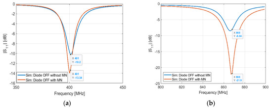 Simulated S11 of the antenna in OFF configuration with and without matching network: (a) at 401 MHz; (b) at 868 MHz.