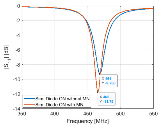 Simulated S11 of the antenna in ON configuration with and without matching network.