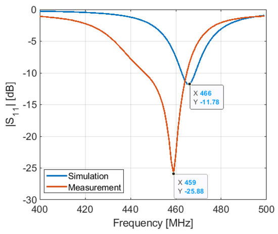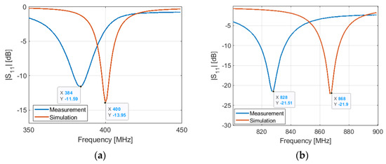 Simulated and measured S11 of the antenna in OFF configuration: (a) at 401 MHz; (b) at 868 MHz.