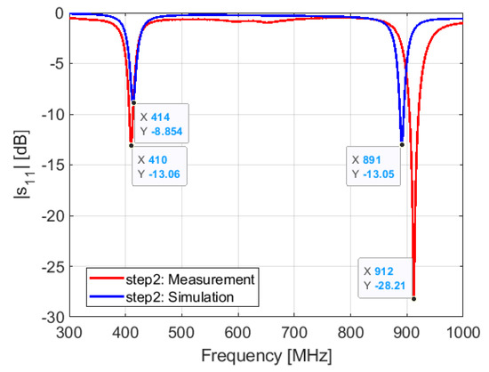 Step 2: after compensating the frequency shift between the simulation and measurement, we replaced the inductor L3 (17 nH) by an inductor of 14.2 nH. The results of the simulation and measurement performed with the inductor L3 = 14.2 nH are shown in Figure 15. We see a frequency shift of 4 MHz for the lower frequency around 410 MHz and 21 MHz for the higher frequency close, 900 MHz. The frequency shift of the higher resonant frequency can be compensated with the diode capacitance Cp, as shown in the parametric studies subsection.