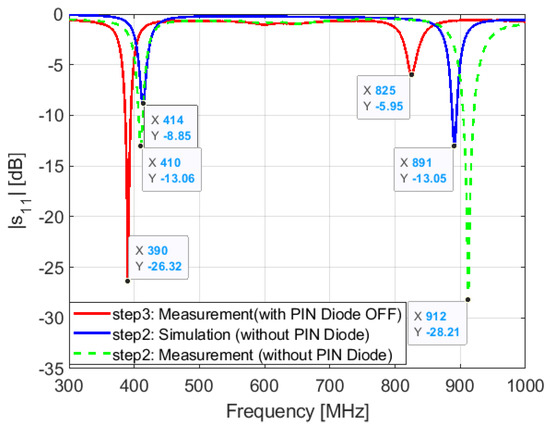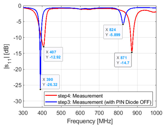 Measured S11 in steps 3 (with PIN diode) and 4.
