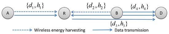 In our considered system model (see Figure 1), node A and node B are IoT nodes or sensors, which both intend to transmit their messages to the BS D with uplink NOMA to improve total spectrum efficiency. Due to long distance and deep fading between A and D, we assume that there is no direct link between them, and the relay R in the midst of A and B assists A to deliver the message to D. Considering that R is an energy-constrained node, and relay forwarding will consume additional energy expenditure, a TS relay protocol [] is employed at R to scavenge energy from A and B.