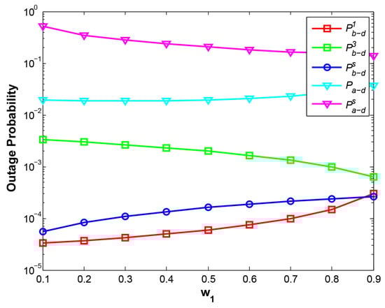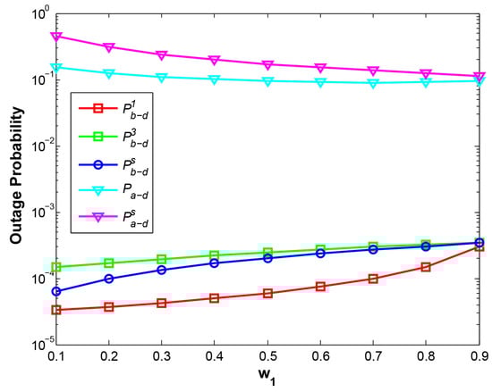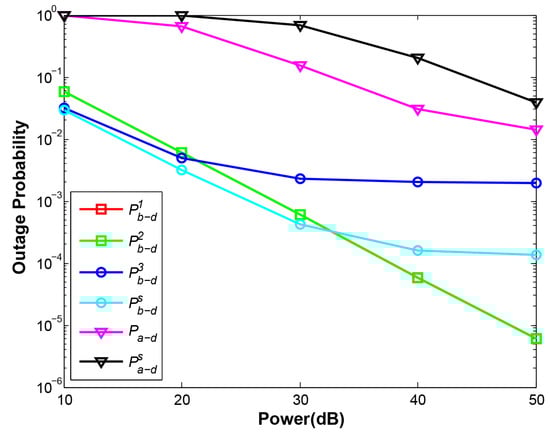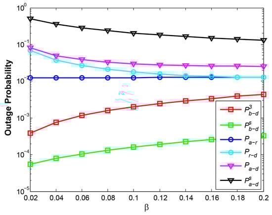The parameter is the power allocation factor at phase 2, so it has no impact on the OPs of B->D at phase 1 and phase 3, which are not shown in Figure 5. With increasing, the OPs of B->D at phase 2 at two cases rise identically due to less power assigned for B and two curves () and () coincide with each other. In terms of OPs of links A->R and A->D at , the stronger transmitting signal from A leads to higher successful decoding rate at R and gains much lower OP of A->R. Hence, the curve () descends rapidly with larger . However, the curves () declines slowly, especially at bigger . The reason is that the OP of link R->D, which depends on the energy harvested at phase 1, is much larger than the OP of A->R, indicating that the OP of link A->D is determined by the OP of link R->D mainly. Additionally, at , it is observed that the OP of A->R declines and obtains a minimum value at = 0.2 but rise with larger . When R is closer to B, R decodes the strong signal from B first, and then decodes the weak signal A. Hence, if is bigger, the stronger transmitting signal from A will prevent the decoding the signal B at R, and finally result in higher OP of A->R. Moreover, if is smaller, weak signal of A also causes higher OP of A->R. Similarly, the OP of A->D presents the same result as the OP of A->R.