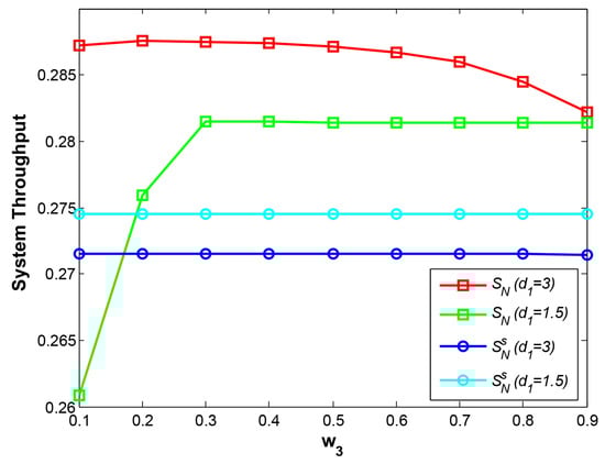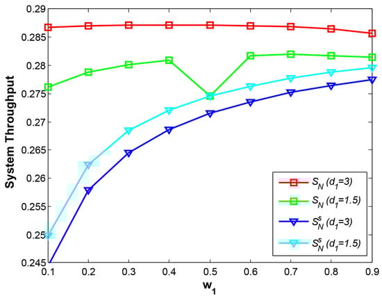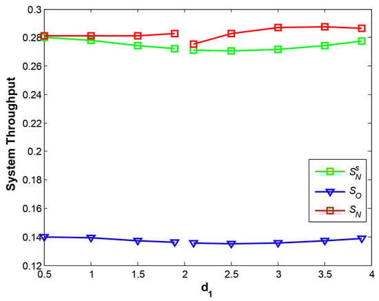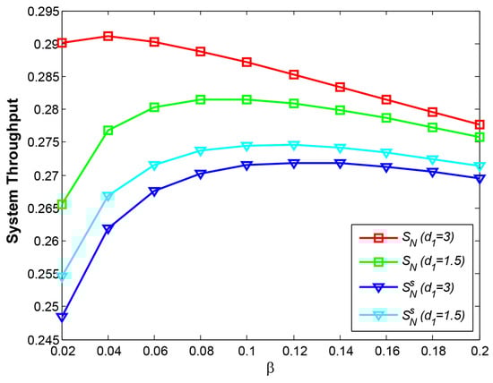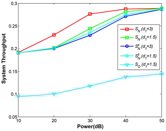Figure 8 shows the relationship between system throughput and . The curve () illustrates the best system performance among all curves. When is smaller, the energy harvested by R is lower, and when is greater, the effective transmission duration becomes shorter. These two cases both lead to the lower system throughput. Therefore, a maximum value in each curve exists at a certain . The curves () and () gain their maximum values at = 0.04 and = 0.08, respectively. In addition, the reason for a larger at than is due to more energy required against long distance fading.