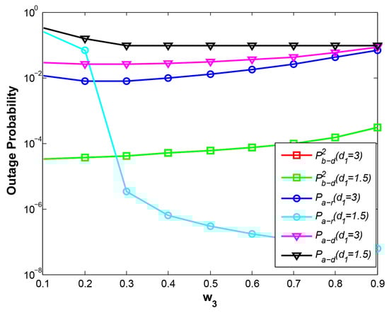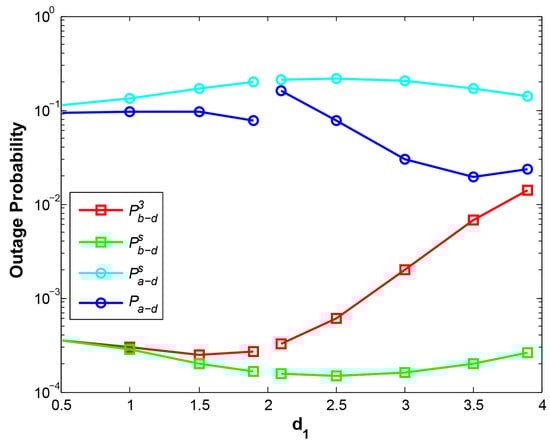 With the larger , the near-end node B is allocated less transmitting power, which leads to greater OP of B->D at phase 1 at two cases, i.e., at = 1.5 shown in Figure 2 and at = 3 shown in Figure 3. However, two curves and demonstrate the opposite results, where the curve drops at and rises at , while rises at and drops at . When the relay R is close to node A (), R can harvest more power with increasing , therefore, the higher power relay signal results in the lower . On the contrary, when R is close to B ( = 3), with rising , R harvests less power from the adjacent node B, which leads to the higher . The reason for different results of at two cases is that the stronger signal of A means the stronger interference with B and the higher value of , and vice versa. As a result, should be carefully considered according to the position of relay node to achieve the required system OPs of two nodes.