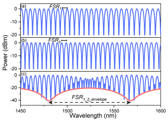 Interference patterns of (a) interferometer 1 and (b) interferometer 2, (c) the superposition of the two output signals (FSR1 ~ FSR2), using the Vernier effect in a series configuration.