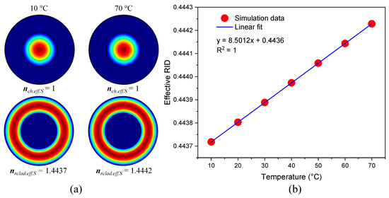 (a) Mode field distribution of the fundamental and cladding modes at two different temperatures (10 and 70 °C), (b) Simulation of the variation of the effective refractive index difference (ERID) at different temperatures.