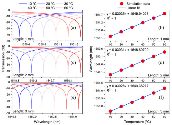 Numerical simulations of the transmission spectra of the MZIs at different temperatures using lengths () of 1 mm (a), 2 mm (c), and 3 mm (e). The wavelength shift of one dip of the spectrum as a function of temperature using lengths () of 1 mm (b), 2 mm (d), and 3 mm (f).