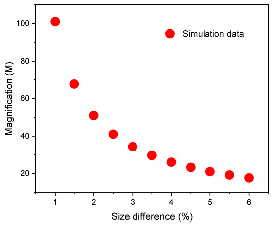 Variations of the magnification (M) as a function of the percentage of the size difference.