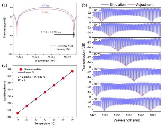 The values of and change as the temperature varies from 10 to 70 °C, while the values of and are calculated at a fixed temperature of 30 °C. The transmitted intensity given by Equation (6) as a function of wavelength for different temperature values is shown in Figure 7b. The transmission spectra show a high-frequency interference pattern modulated by a low-frequency envelope (FSRenvelope = 117.9 nm). For sensing applications, monitoring the wavelength shift of the low-frequency envelope is carried out by fitting one of its dips. As shown in Figure 7b, the dip of the envelope experiences a redshift as the temperature is increased. It is worth mentioning that the temperature sensitivity of the two cascaded MZIs is 2.0336 nm/°C, which can be estimated from Figure 7c. Comparing the temperature sensitivity of the sensing MZI with the two cascaded MZIs (), it is quite easy to realize that the temperature sensitivity of the two cascaded MZIs is ~67.16 times higher than the sensitivity of the single MZI.