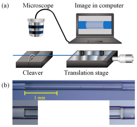 As previously explained, the fabrication of two similar MZIs is vital in this work since connecting both in Vernier configuration generates large values of M. The fabrication process used in this research depends on an experimental setup designed to cleave the CHCF lengths accurately. This setup consists of a translation stage where a segment of SMF is set in a v-groove and held with the help of two magnets; meanwhile, the part of the optical fiber that needs to be cut rests on a fiber cleaver (see Figure 8a). Then, the SMF tip is set in a fusion splicer to splice it, either with an MMF or a CHCF. After splicing, the fiber is put back into the cleaver where the splicing section is above the blade, corresponding to the zero position. Afterwards, the micrometer screw of the translation stage moves to a specific length, and the fiber (MMF or CHCF) is cut with high precision using the cleaver. All of these steps are carried out without removing the magnets that attach the SMF to the translation stage. Additionally, a microscope connected to a computer is used to observe the initial position of the optical fiber to have better control of the cutting process.