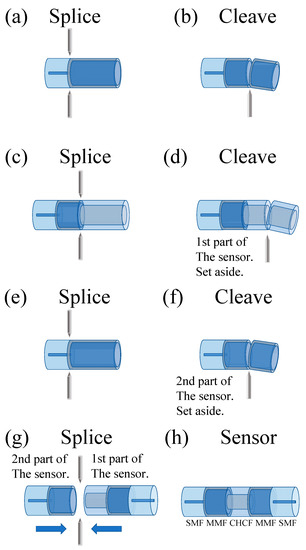 The fabrication process of this MZI can be separated into two parts, as shown in Figure 9. The experimental setup described in Figure 8 was used to construct this device. The first part of this process consisted of splicing an SMF to an MMF, and then a section of MMF (1 mm) was cleaved. This MMF section works as a beam splitter to the interferometer. After that, the MMF was spliced to a CHCF, and then a section of CHCF was cleaved to a specific length (we used lengths from 0.5 to 3 mm in steps of 0.5 mm), see Figure 9a–d. The second part comprised constructing another beam splitter by splicing and cleaving a section of MMF to an SMF, as shown in Figure 9e,f. Finally, to complete the fabrication process of the MZI, it was necessary to splice these two parts, as shown in Figure 9g,h. Figure 8b shows a lateral view of the fabricated devices as well as the splicing section between MMF and CHCF.