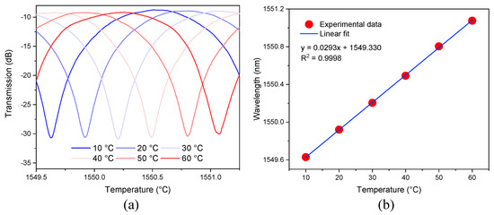 (a) Experimental spectra of the sensing MZI at different temperatures, (b) Wavelength shift of one dip of the spectrum as a function of temperature.