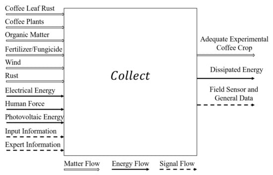 The following step is to design a black box [25], which represents the primary function of the system to be developed. This primary function is to collect a set of inputs, transform them, and produce a set of outputs. As shown in Figure 1, the inputs and outputs are divided into three major flows: namely matter, energy, and signal. Regarding the inputs, the matter flow was composed by CLR, coffee plants, organic matter, fertilizer/fungicide, and wind; the energy flow was divided into electrical energy, human force, and photovoltaic energy; and the signal flow consisted of input information and expert information. At the output, the adequate experimental coffee crop dissipated energy as well as field sensors and general data records were obtained. These output data correspond to the main objective of this research, which is to create a system capable of collecting, storing, and transferring reliable data of a test bench coffee-crop towards the CLR diagnosis.