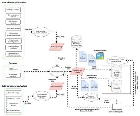 Furthermore, employing sensors in each lot, soil moisture/temperature, pH, illuminance, and environmental humidity/temperature were acquired. In addition, RGB and multi-spectral images were captured. To finish the data collection process, data were stored locally, pre-processed for cleaning purposes, and then sent to a remote server over the Internet. In addition, the collection process was monitored in real time through an IoT web platform.