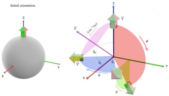 The rotated object final orientation is determined based on Euler angles or quaternion parameters, as given in Equations (2) and (3). Let V be a vector pointing to the initial front direction of the object and let the final object orientation be represented by V as shown in Figure 1. Then, V is computed from V and the Euler rotation angles, as indicated in Equation (2).